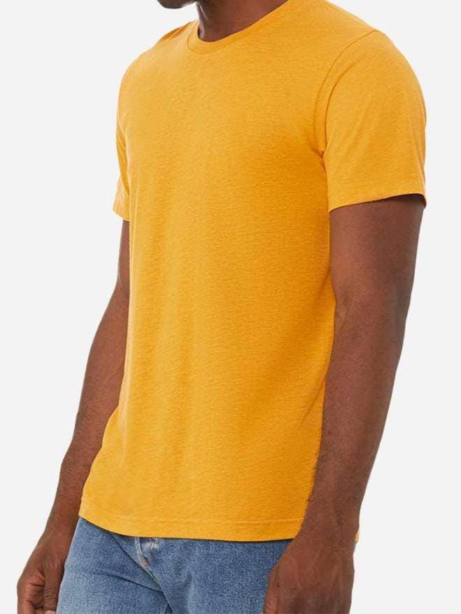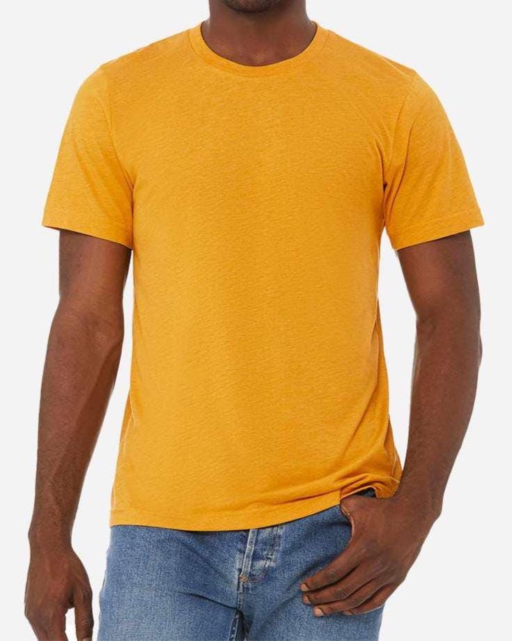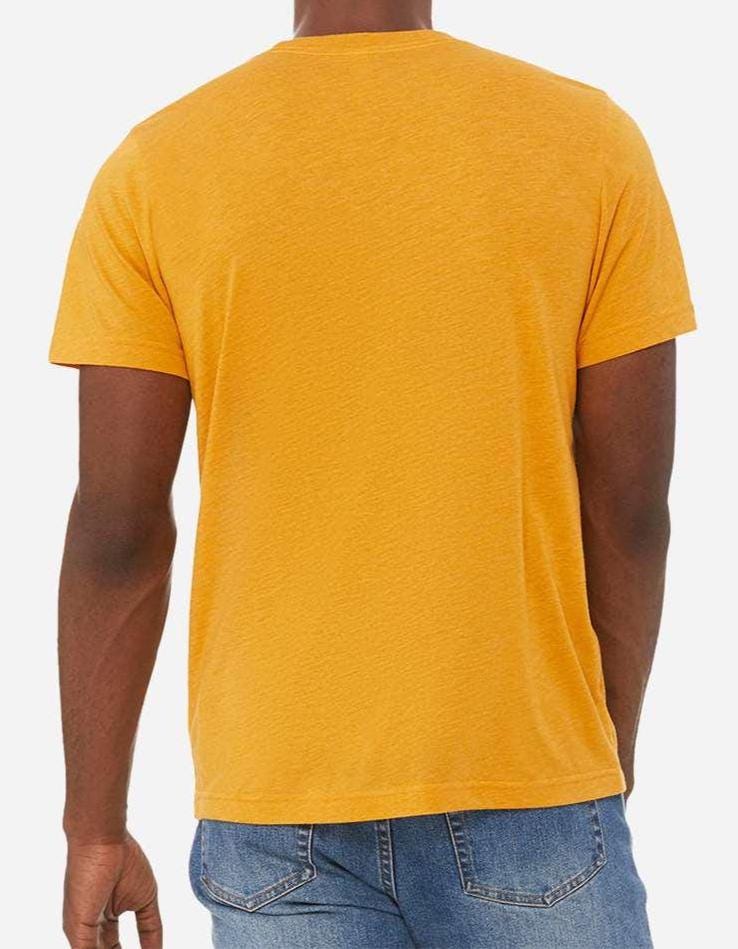 The Shirt: BELLA+CANVAS* 3413 Heather Mustard. A Tri-blend consisting of 50% polyester, 25% combed ring-spun cotton, 25% rayon