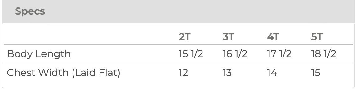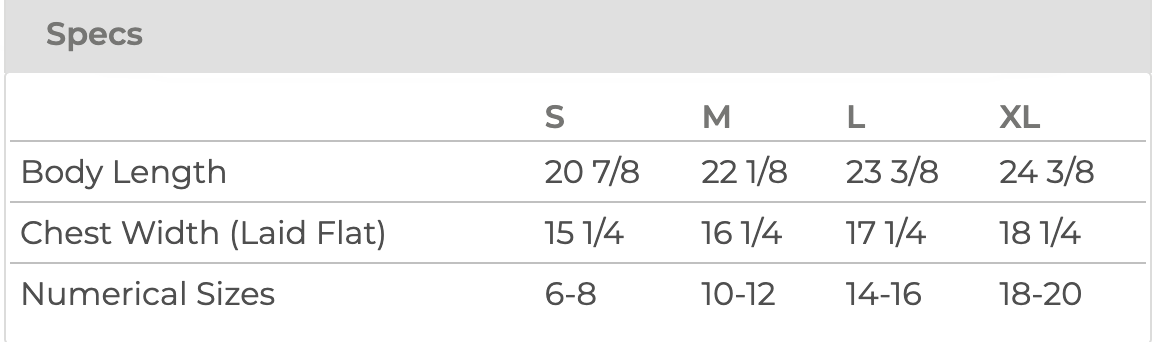 Sizes: 2T, 3T, 4T, 5T, S(6-8), M(10-12), L(14-16), XL(18-20)